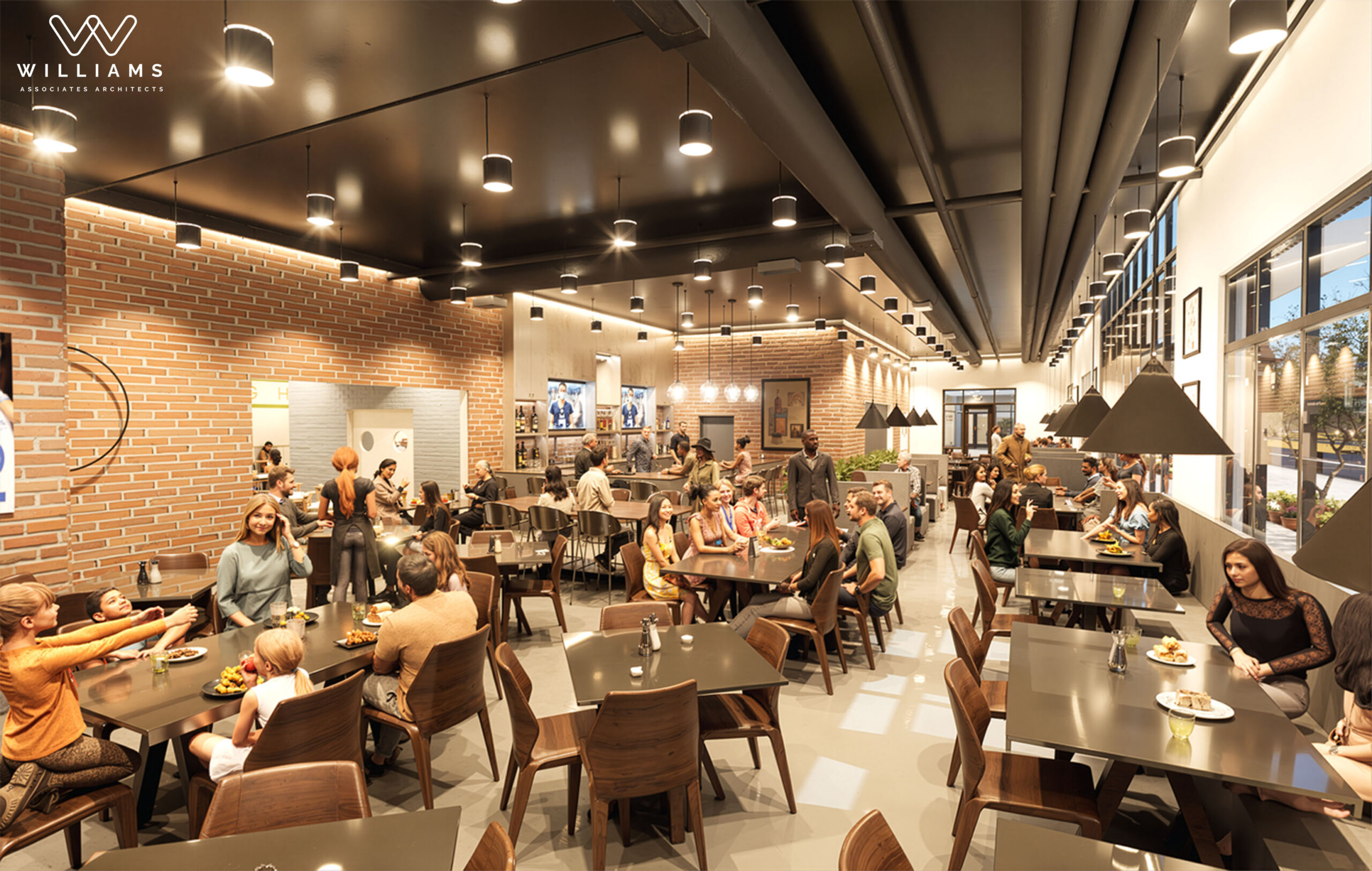 The space occupies half of Building B and is connected to its partner restaurant, the adjacent breakfast concept, creating a cohesive dining experience within the development.