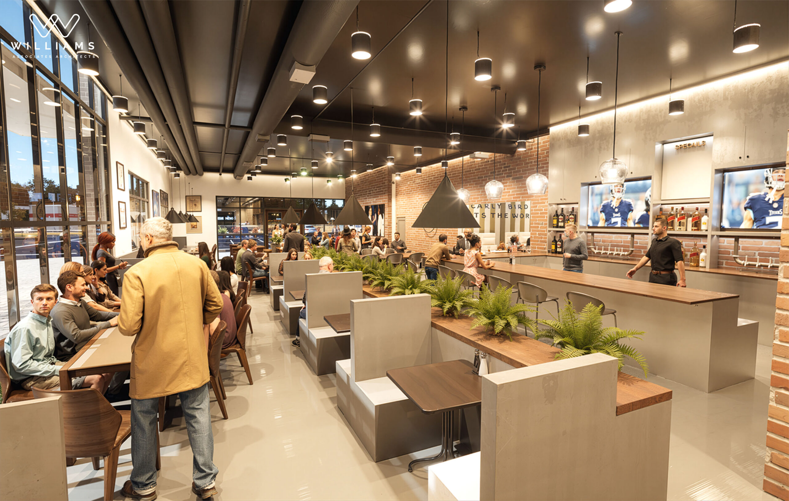 This project is a new sports bar and tap house located in The Lookout area of the Evergreen Commons development. Our team developed the initial floor plan and produced detailed interior renderings to support marketing efforts.